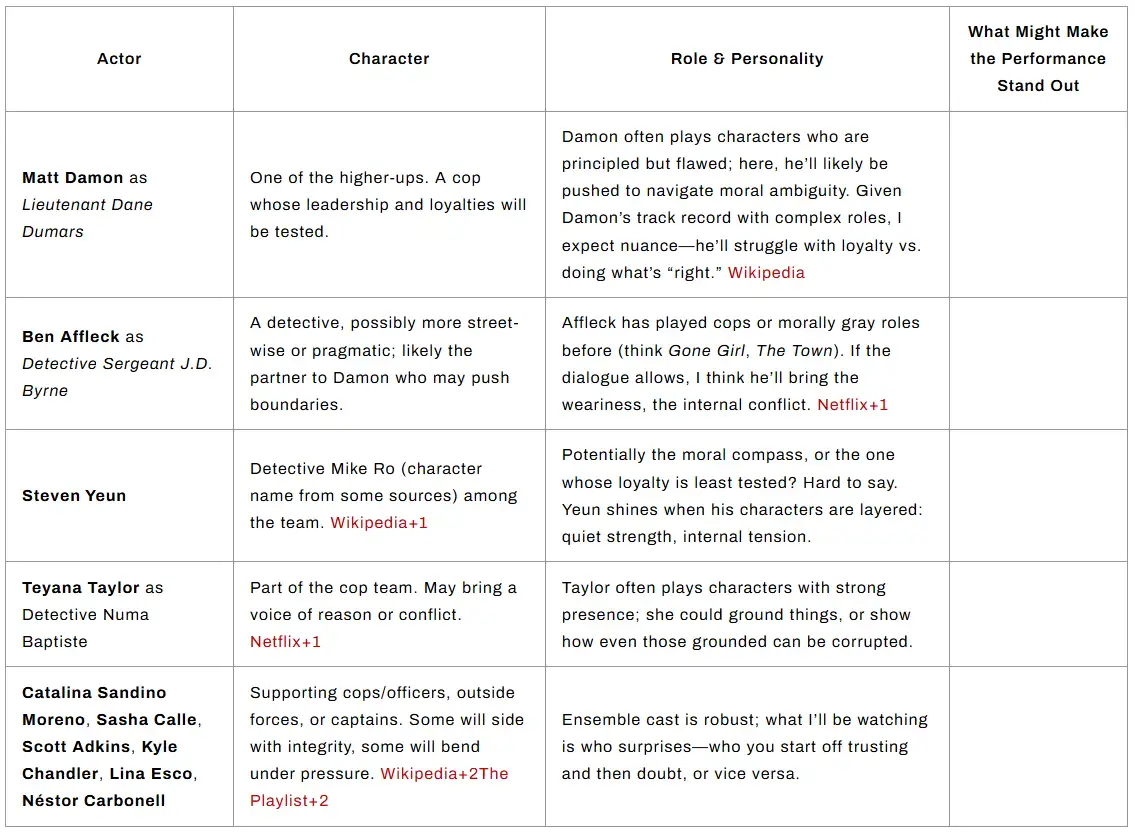Possible weaknesses—or probable risks: falling into familiar tropes (dirty cops, betrayal, outside forces), predictability in who’ll crack or stay steady; needing to balance between thriller-moment action and character arcs so neither feels hollow; could be heavy or dark enough to weigh on the viewer without enough relief. Also, ensemble films with many characters always risk some being underwritten.
